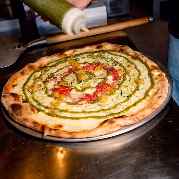 A focused menu centred on stone-baked Neapolitan pizzas made to order. Expect a soft-centred crust and simple, fresh toppings. Seating mixes tables and bar spots, so the place works for solo diners, couples and small groups. Service is practical and friendly rather than formal.
