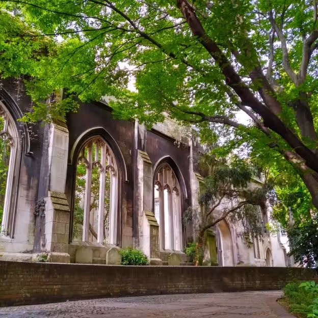 A leafy ruin tucked into the City, cinematic light and calm in the heart of London.