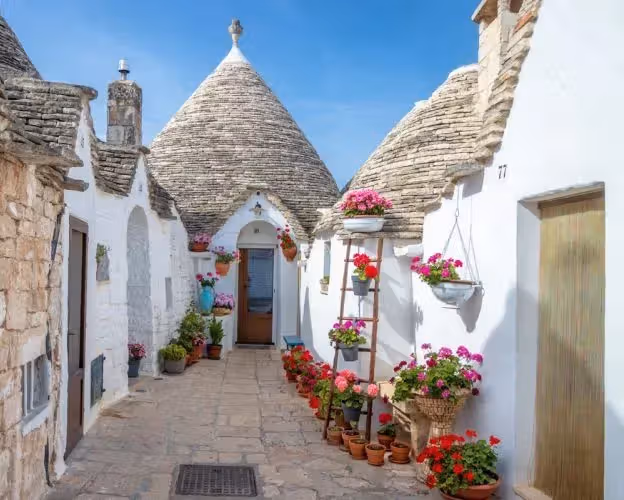 Expect a maze of narrow streets lined with low, rounded houses made from local limestone. Two main clusters are the most visited: one with souvenir shops and viewpoints, the other quieter and more residential. You will see close-up examples of the trulli roofwork, carved stone details and small courtyards. The topography is gentle but many surfaces are uneven, so wear steady shoes.