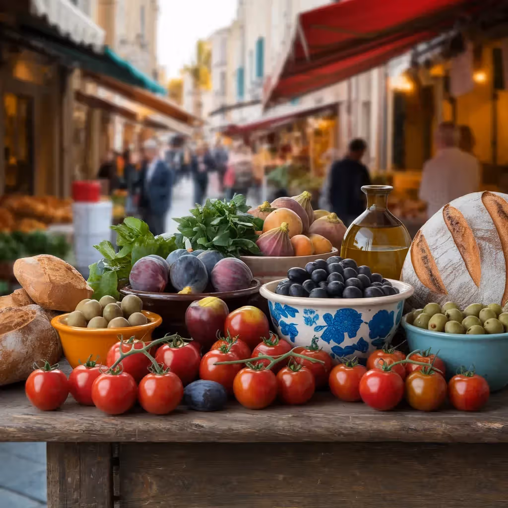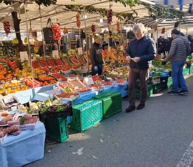 Open-air rows of stalls and crates stacked with seasonal produce. Expect direct exchanges with vendors, sharp colours and strong scents from ripe fruit, herbs and olive oil. The atmosphere is purposeful rather than touristy, focused on buying and restocking rather than sightseeing.