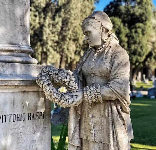 Extensive funerary art in marble and bronze, ornate family tombs and small chapels set along terraced paths. The site covers varied levels, so expect steps and uneven surfaces. The atmosphere is formal and reflective, suited to people interested in history, sculpture and local heritage.