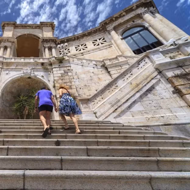 A broad terrace reached by a set of stone steps, open sightlines and room to move around. Expect photographers, couples and small groups taking in the panorama. The piazza is exposed, so it can feel windy in cooler months and lively at sunset and after dark.