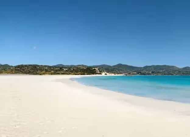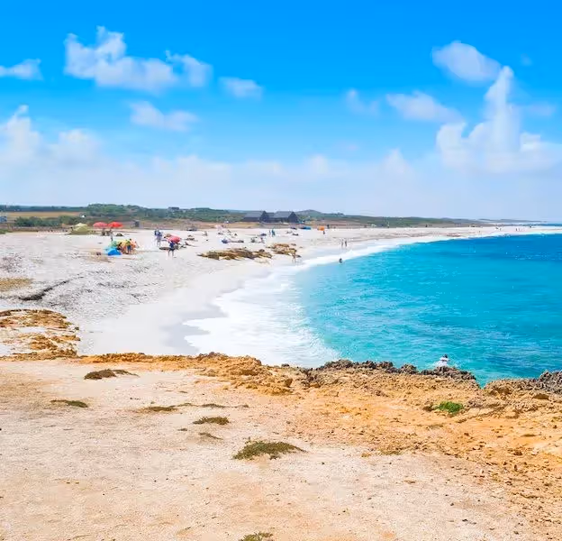 Soft, fine sand that slopes gently into calm water, good for paddling and family beach time. The shoreline opens onto shallow bays and clearer, deeper pockets near the rocks where snorkelling is best. Inland from the sand is a salt lagoon often visited by wading birds, including flamingos at certain times of year. Facilities are limited in places: there are seasonal kiosks and some rental areas, but large stretches remain natural and exposed to sun and wind.