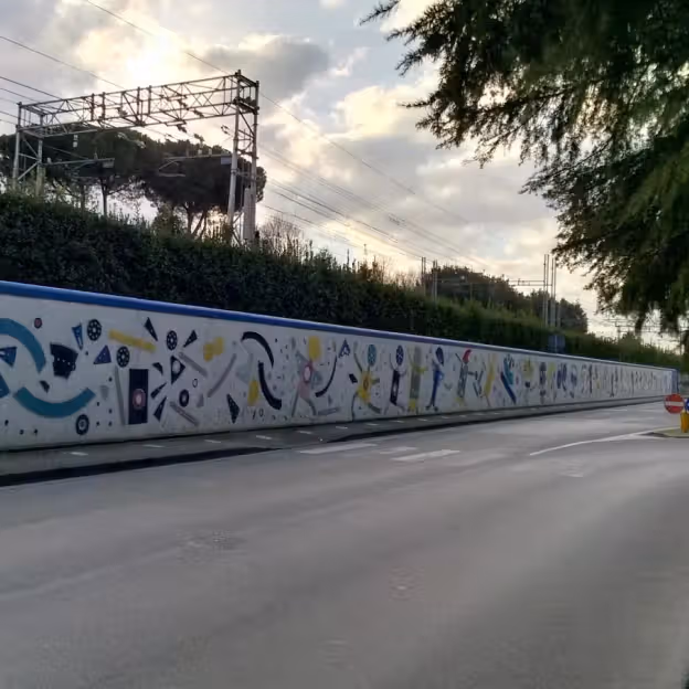 A large-scale mural with bold shapes and quirky figures. The work sits at street level, so you see brushstrokes, texture and scale up close. There is no dedicated entrance or ticketing, it is part of the public realm and often viewed alongside passing traffic and local life.