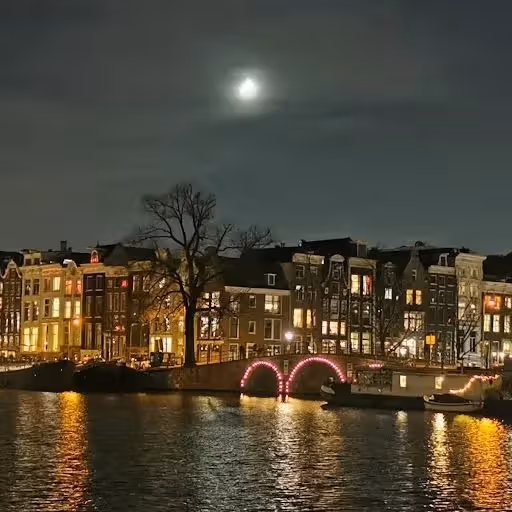 A lantern-lit, slender crossing where Amsterdam's canals compose their own postcards.