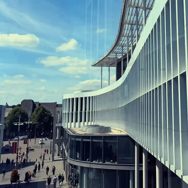 Expect strong geometric lines and layered forms seen from the quay. Public access is concentrated at street level around the building; interior access depends on tenants. The riverside promenade offers clear sightlines and places to pause and watch river traffic.